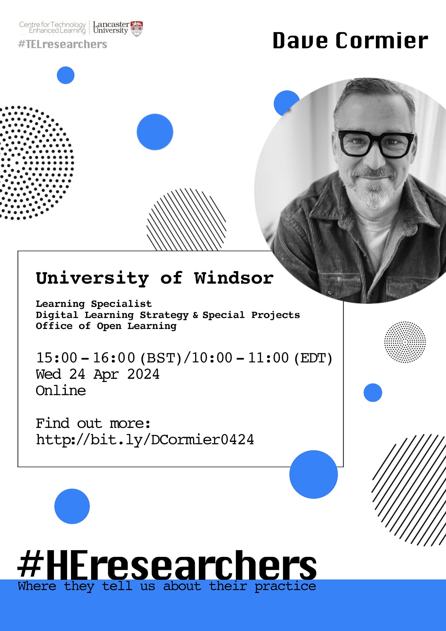 We are looking forward to welcoming Dave Cormier to join us in hopefully a warm spring afternoon in the UK/morning in Canada. Some of Dave’s earlier work include coining the term “MOOCs” (Massive Open Online Courses) and the notion of rhizomatic learning, which have had a massive impact on learning design and learning and teaching practices.